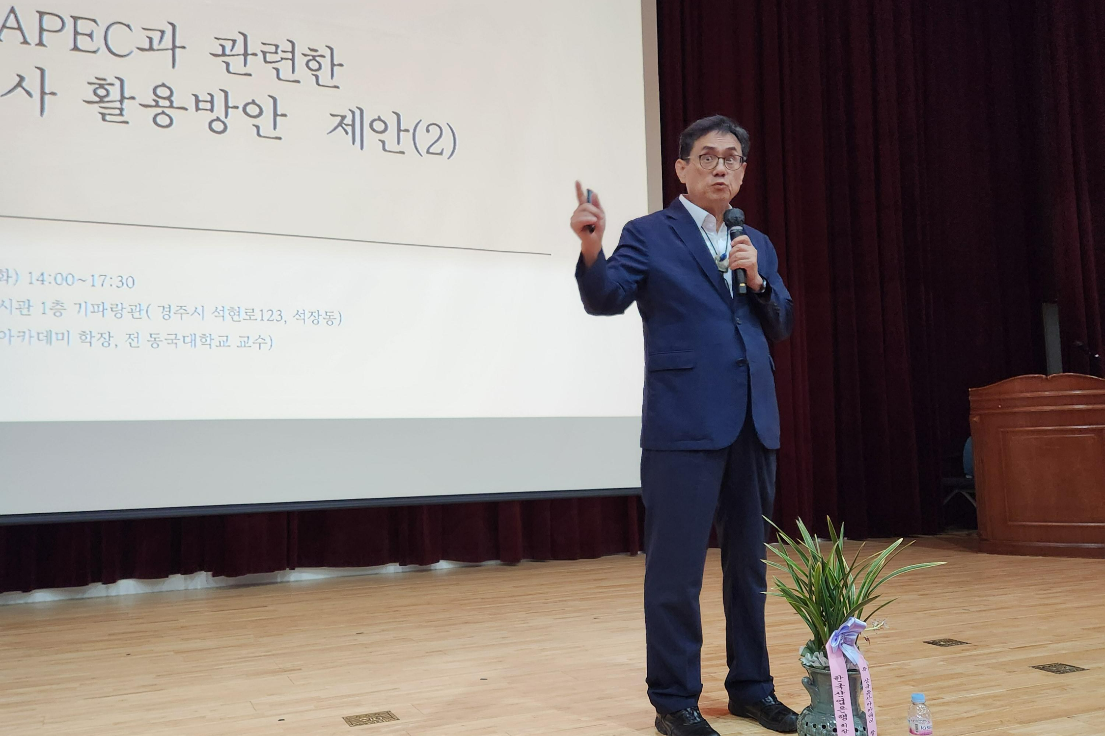 이어서 강석근 학장은 ‘APEC과 관련한 삼국유사의 활용방안 제안(2)’에서, 4가지 구체적 활용방안을 제시하였다. 첫째는 효 이야기로, 현생과 전생의 부모를 위해 불국사와 석굴암을 지은 김대성 이야기와 어머니의 밥을 빼앗아 먹던 아들을 땅속에 묻으려다가 돌종을 발견한 효자 손순 이야기가 실린 삼국유사 효선(孝善)편은 ‘K-효 콘텐츠의 정수’이며 예기(禮記)의 부자자효(父慈子孝)와 같은 상호 호혜적인 효도와 선행을 담은 내용으로, 경주를 찾는 관광객들에게 자연스럽게 효의 가치를 인식하게 하는 중요한 콘텐츠이므로 APEC 때, 불국사 청운교 앞에서 김대성의 효와 관련된 공연을 개최하여, K-효 콘텐츠의 진정한 가치를 세계인들에게 알리고자 하였다.